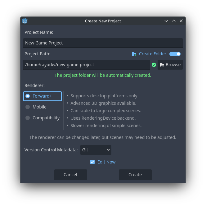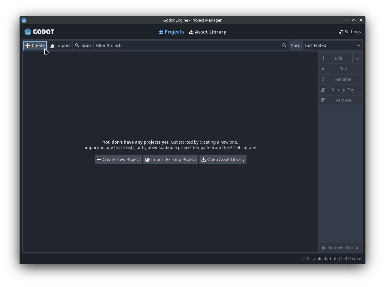 Clicking on the Create button will finally create the project with the settings you chose. If the Edit Now checkbox is ticked, the Editor will open immediately after project creation.